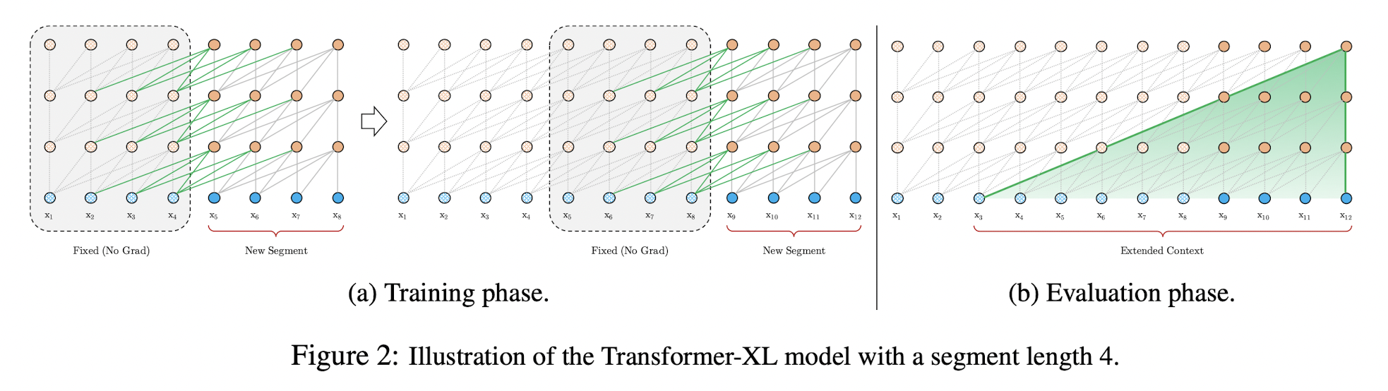 훈련 중, 이 전 segment를 계산한 hidden state sequence는 고정(fixed)되고 저장(cached)됩니다. 이는 추후에 모델이 새로운 segment를 처리할 때 확장된 context로 재사용됩니다. Fig 2(a)에 해당하는 부분입니다. 이러한 추가적인 입력은 네트워크가 과거의 정보를 이용할 수 있게 하고, long-term dependency 모델링 능력을 키워주는 것뿐 아니라 context fragmentation을 피할 수 있게 해 줍니다.