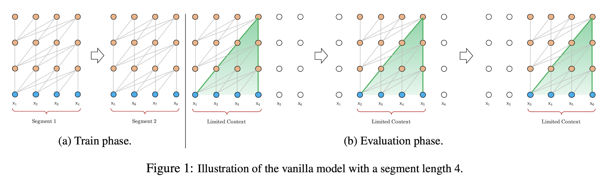 Evaluation phase에서 vanilla model은 훈련에 사용된 길이와 동일한 길이의 segment를 사용하지만 제일 마지막 위치에서 단 하나의 예측만을 만들어냅니다. 그리고 다음 step에서 segment는 딱 하나의 position만큼 오른쪽으로 이동하고, 새로운 segment를 이용해 처음부터 다시 이 전 단계의 과정을 진행합니다. 이는 Fig 1(b)에 해당합니다. 이러한 방식은 각 예측에서 훈련 중에 봤던 가장 긴 context를 활용할 수 있게 하고, context fragmentation issue도 완화해줍니다. 하지만 비용이 너무 비싸다는 단점이 있습니다.