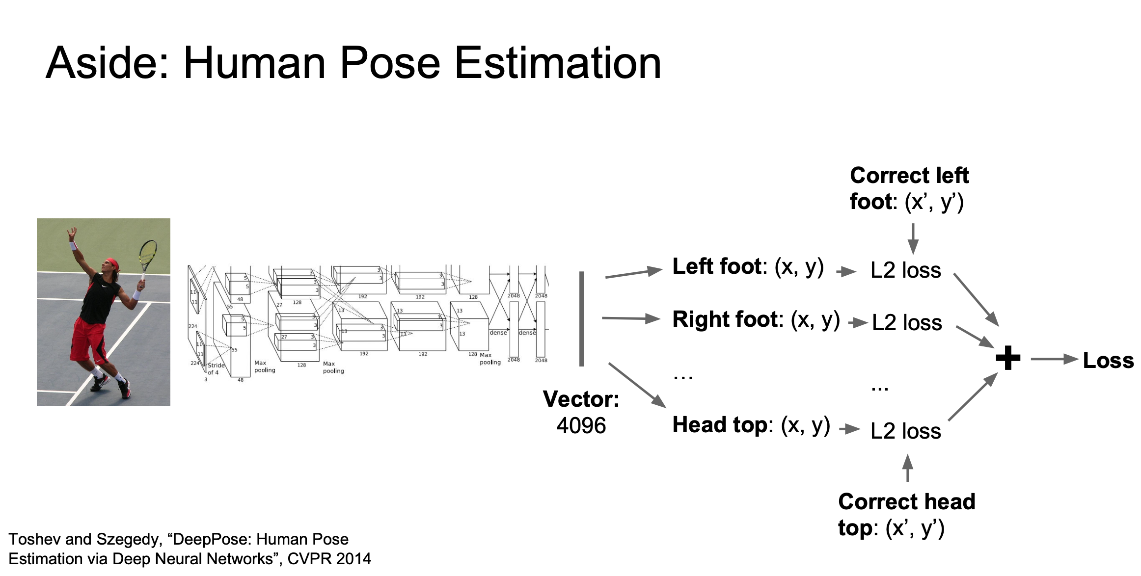 이번에는 출력에 bounding box의 좌표가 있는 게 아니라 각 관절의 좌표가 있습니다. 이렇게 예측된 14개의 점들에 대해서 regression loss를 계산하고 backprop 시켜서 학습을 진행하게 됩니다.