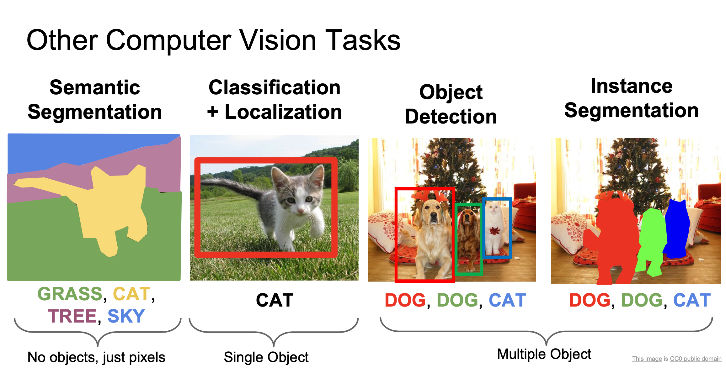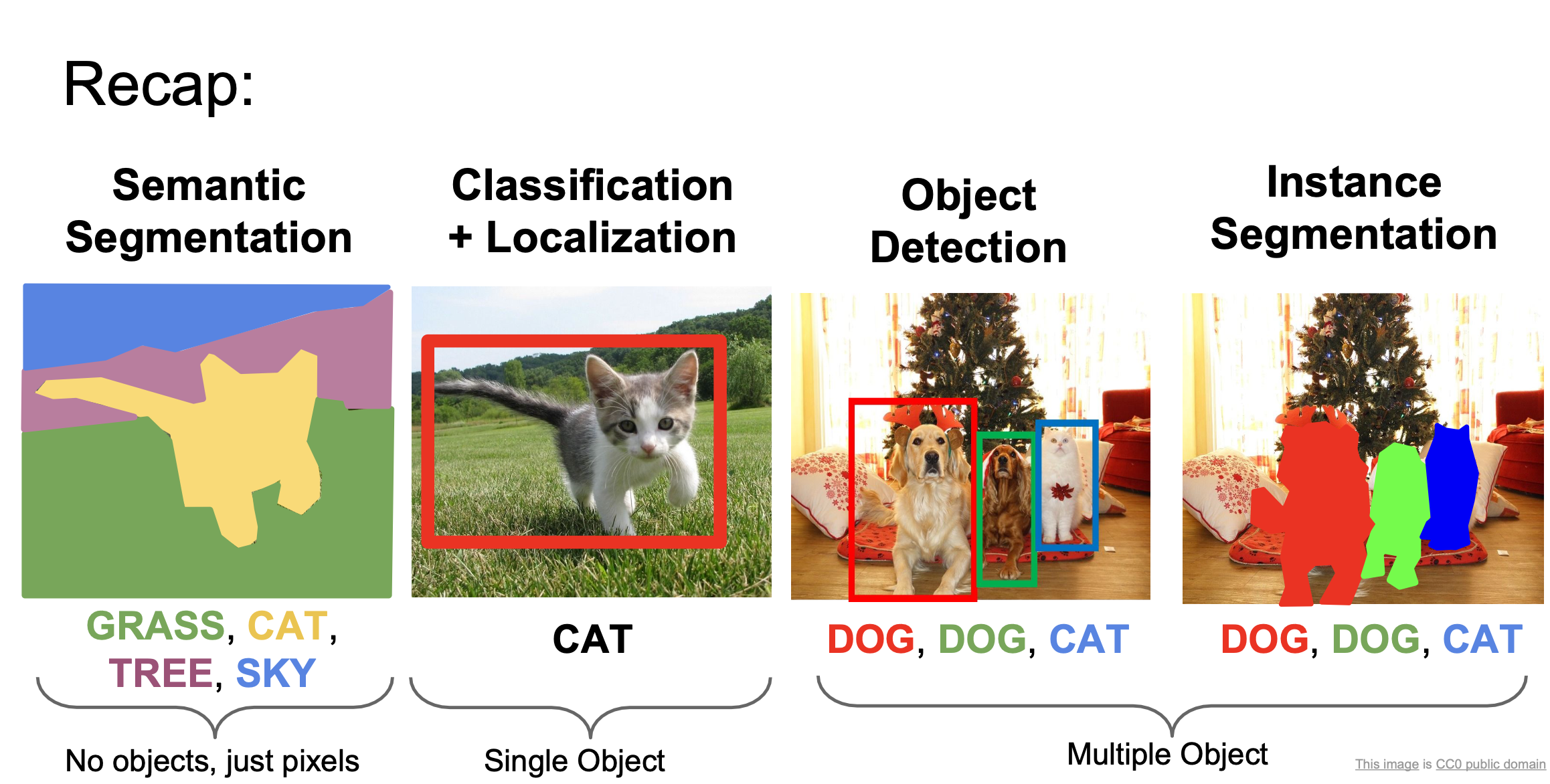 지난 강의에서는 RNN에 대해서 배웠습니다. 이번 강의에서는 Segmentation, Localization, Detection과 같은 여러 CV의 task에 대해 배워 보겠습니다.