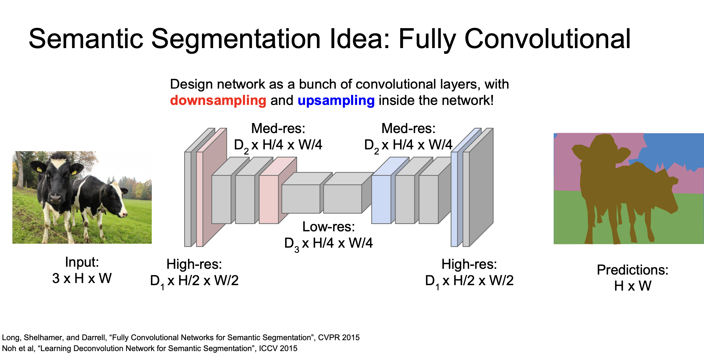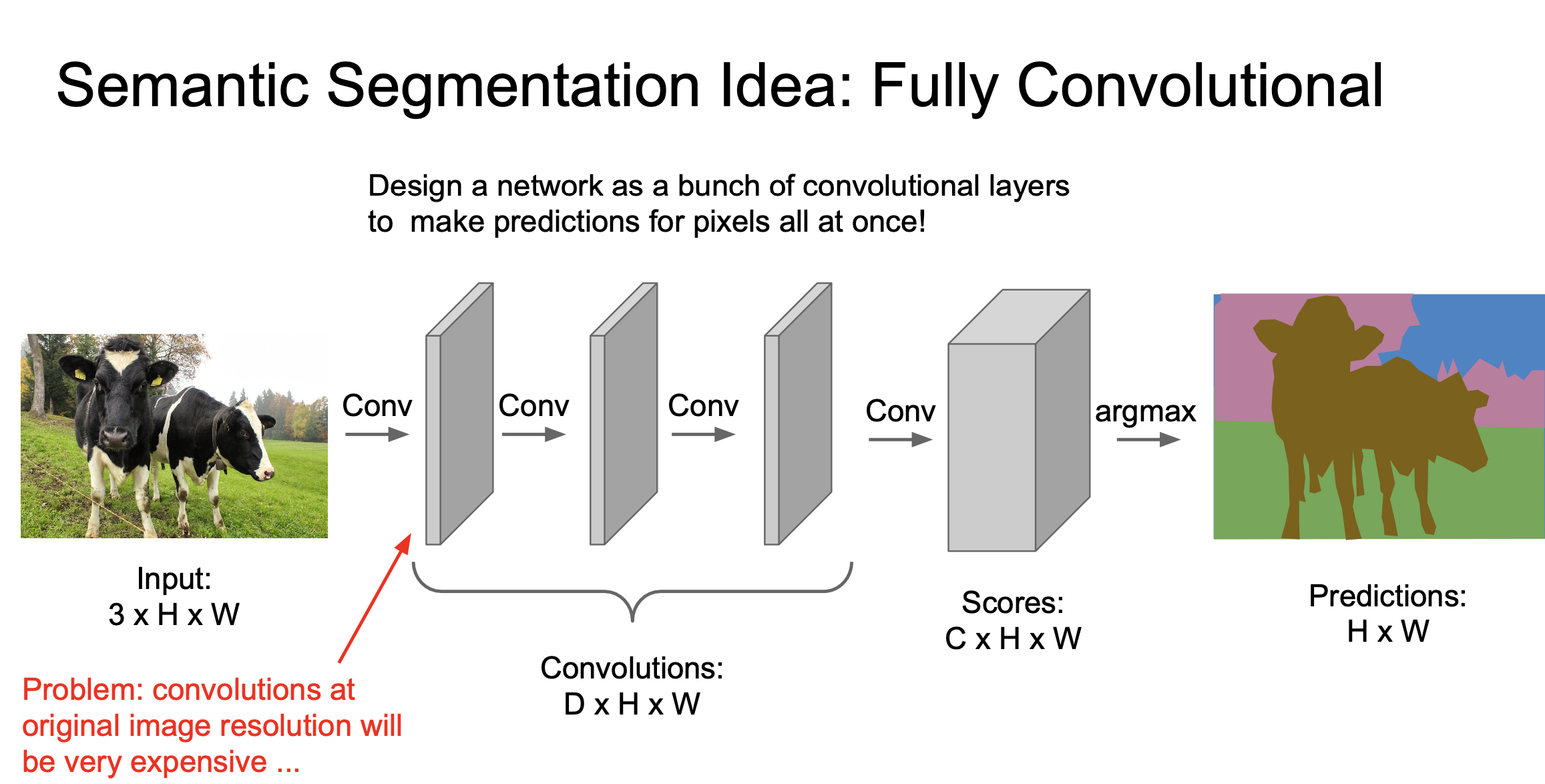 3x3 필터, zero-padding을 수행하는 layer를 쌓으면 이미지의 공간 정보를 손실하지 않을 것이고, 이 네트워크의 출력 tensor는 CxHxW가 될 것입니다.( C : 카테고리 수)