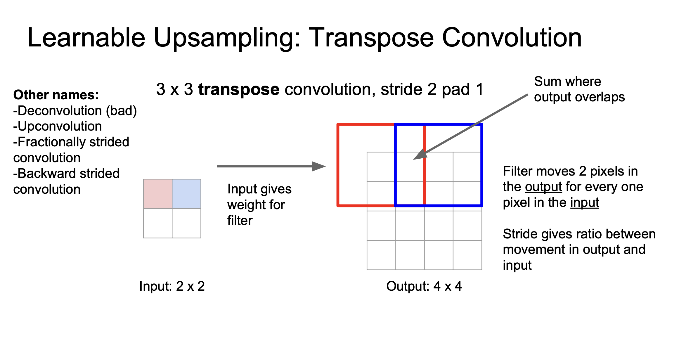 이 방법은 다른 말로는 deconvolution, upconvolution, fractionally strided convolution, backward stride convolution이라고 부르기도 합니다.