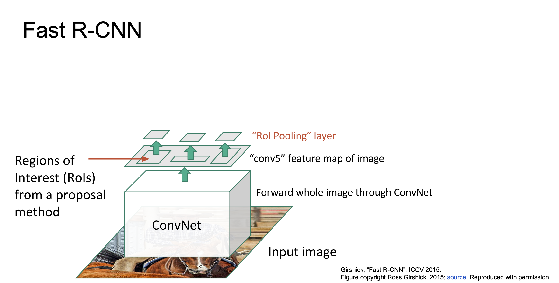 Fast R-CNN은 R-CNN과 시작은 같습니다. 하지만 각 ROI마다 CNN을 수행하지 않습니다. 먼저 전체 이미지에 CNN을 수행하고, 그 결과로 전체 이미지에 대한 고해상도 Feature Map을 얻습니다.