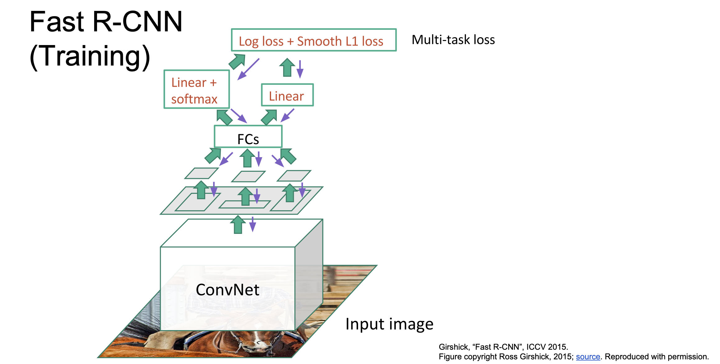 ROI크기를 조정하고 나면 아래 그림과 같이 FC-layer의 입력으로 넣어서 Classification score와 linear Regression offset을 계산할 수 있게 됩니다. 학습 시에는 이 두 개의 loss를 합쳐 Multi-task loss로 학습을 진행합니다.