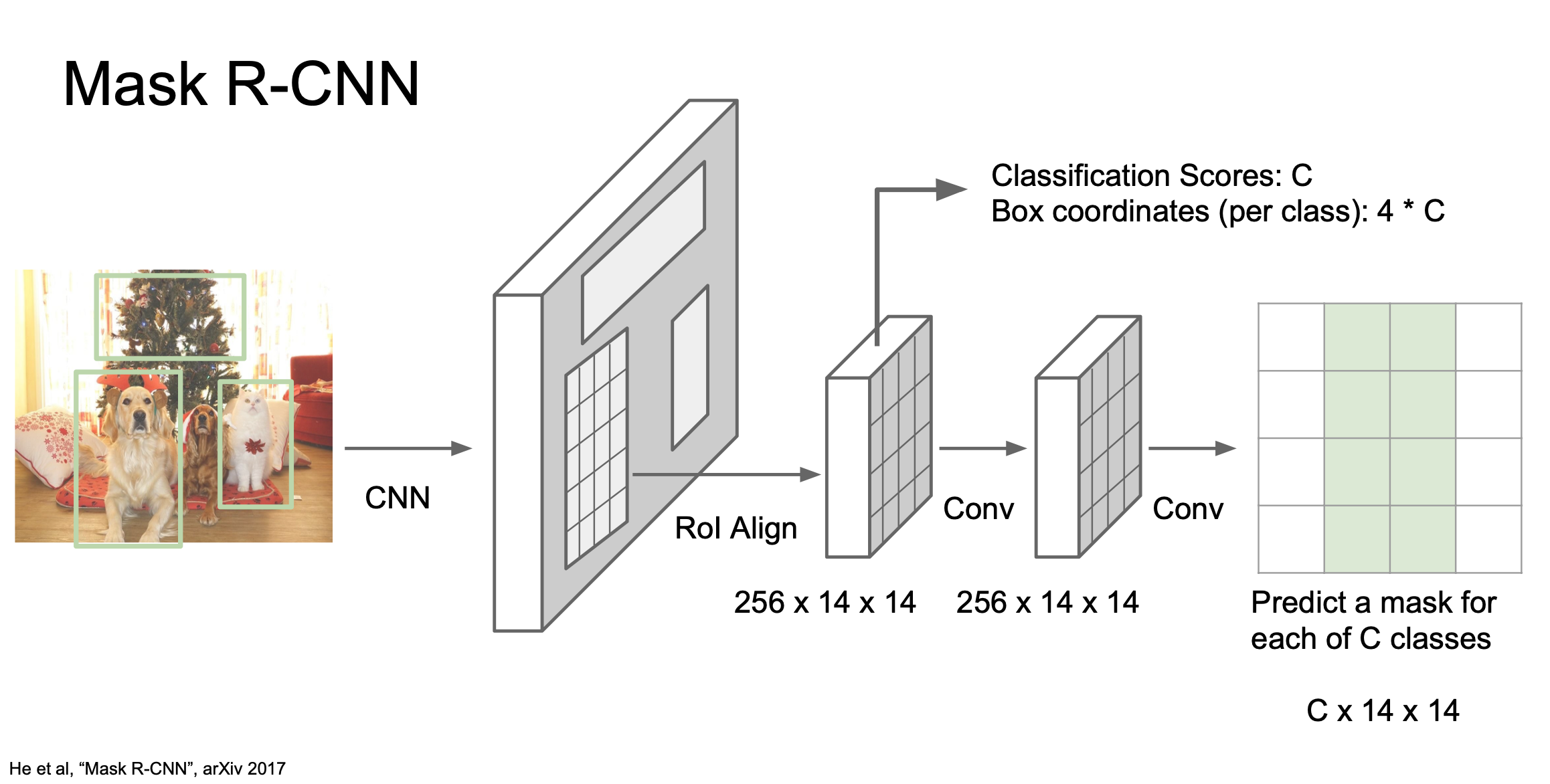feature map으로부터 ROI pooling(align)을 하면 두 갈래로 나뉩니다. 위쪽으로 가는 갈래는 Faster R-CNN과 비슷합니다. 그리고 하단의 두 번째 갈래는 Semantic Segmentation을 위한 미니 네트워크처럼 생겼습니다. 각 픽셀마다 객체인지 아닌지를 분류합니다.