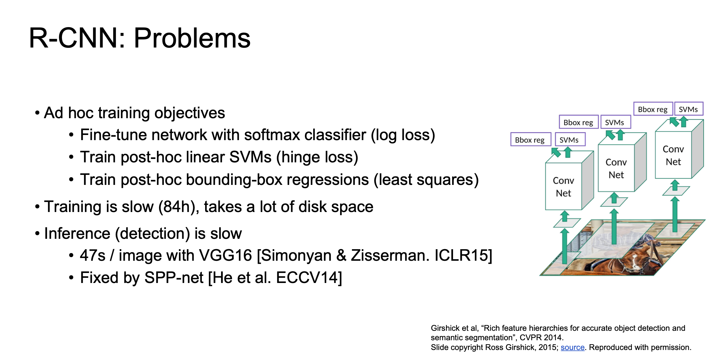 - 여전히 계산비용이 비쌉니다. 2000개의 Region Proposal이 있고 각각이 독립적으로 CNN에 들어가기 때문입니다.