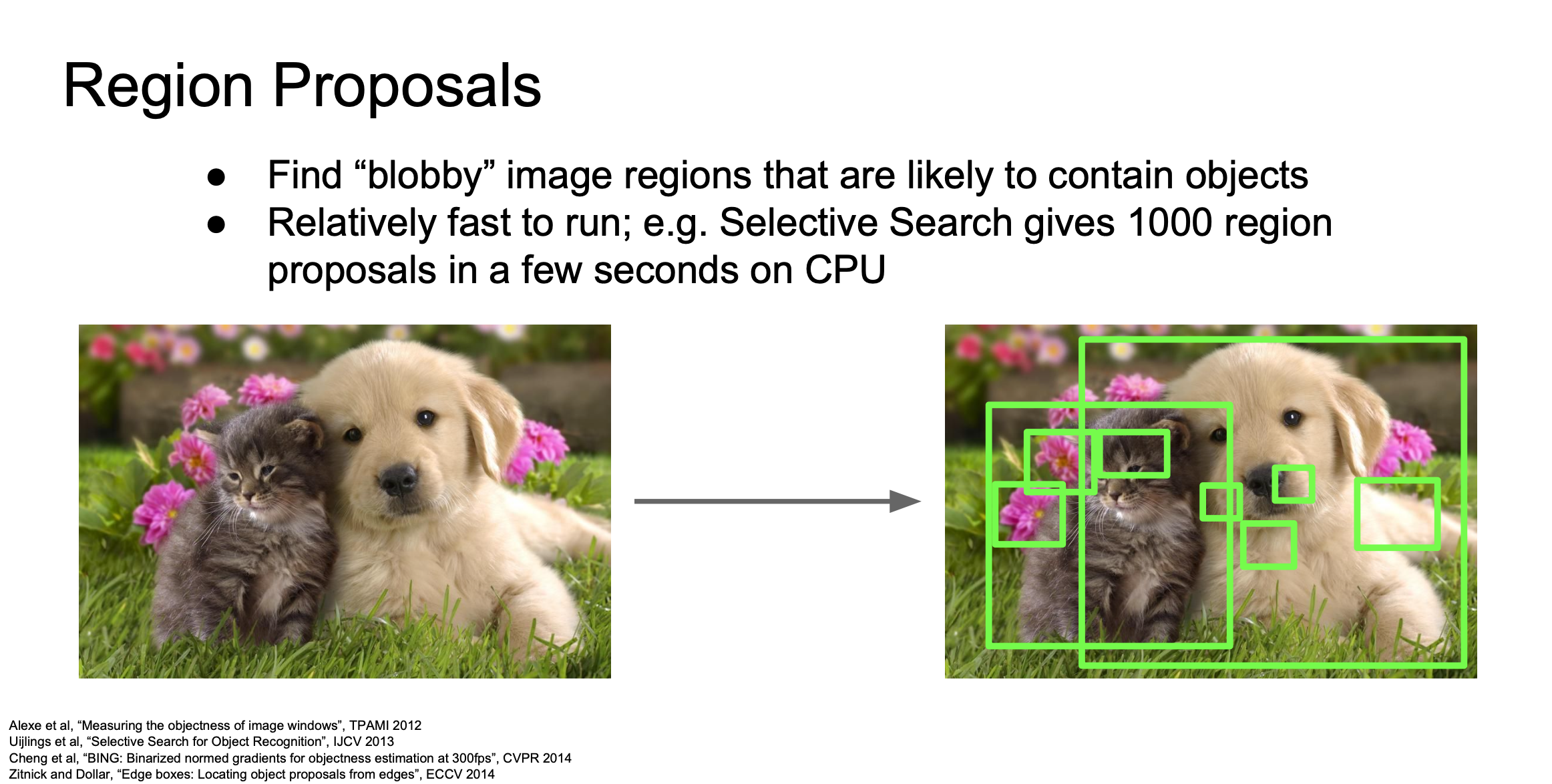 대신 Region Proposals라는 방법이 있습니다. 사실 이 방법은 딥러닝을 사용하지는 않고 전통적인 신호처리 기법을 사용합니다.