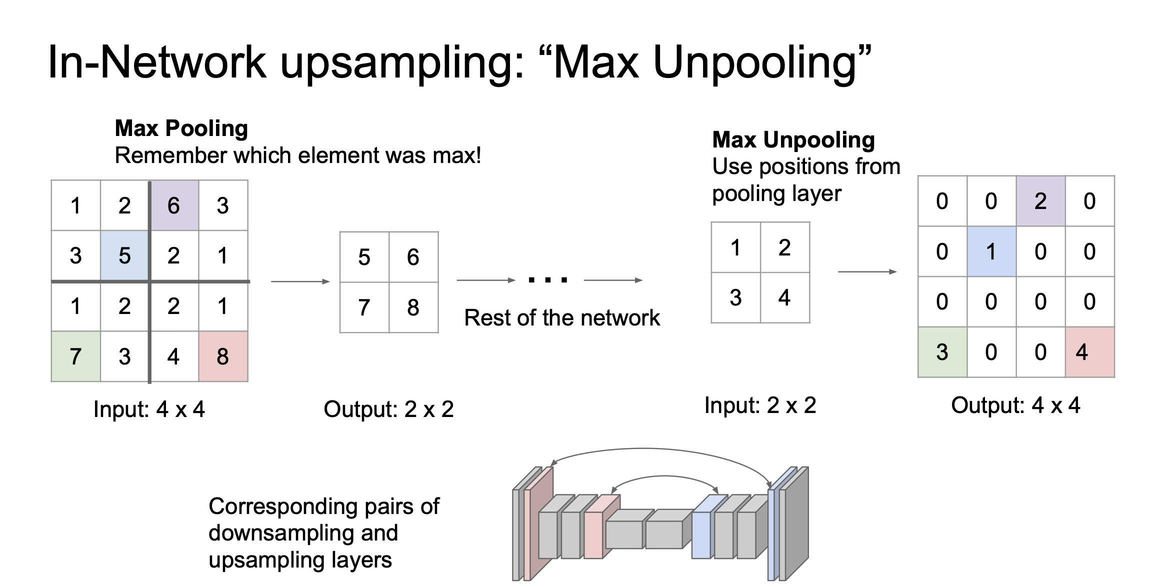 3. max unpooling : unpooling과 pooling을 연관 짓는 방법입니다. downsampling을 진행할 때 max pooling에 사용했던 요소를 기억하고 upsampling시에 bed of nails와 유사한 방법으로 진행하지만 단지 같은 자리에 복사를 하는 것이 아니라 이전 max pooling 할 때 선택된 위치에 넣어주게 됩니다.