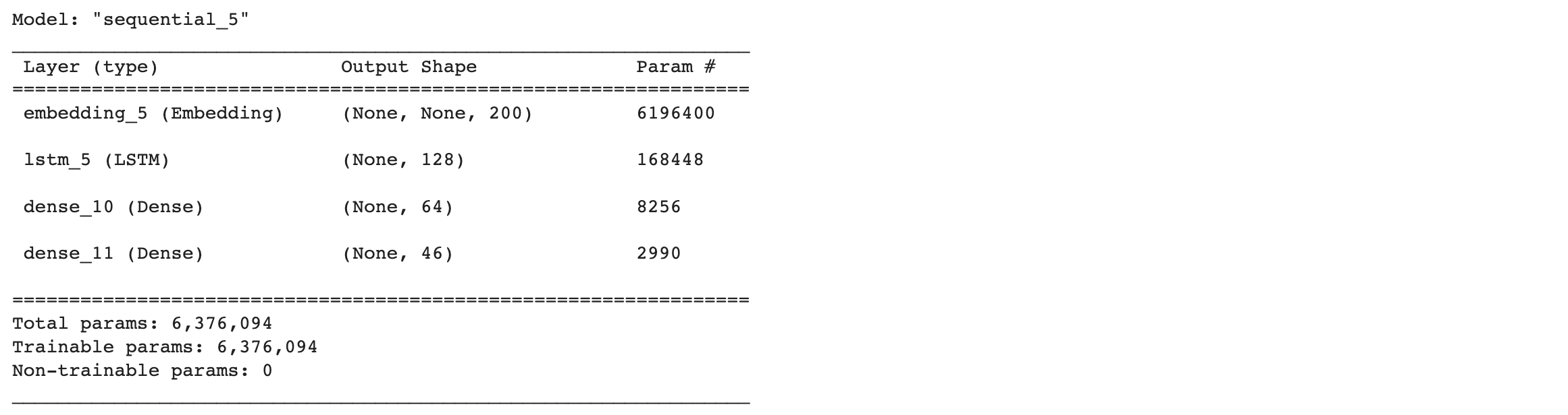 model.add(tf.keras.layers.Dense(46, activation='softmax')) # 클래스가 총 46개라 마지막층은 46개의 결과가 나와야합니다.