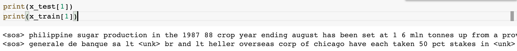 근데 지금 데이터가 다 정수화 되어있어서 실제 뉴스의 내용을 모른다는 단점이 있습니다. 정수를 단어로 바꿔주는 함수를 정의해서 실제 텍스트를 확인해보겠습니다.