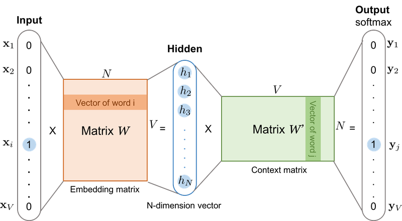 그림에서 주황색 사각형이 첫 번째 가중치 행렬 $W$, 초록색 사각형이 두 번째 가중치 행렬 $W^\prime$입니다. 이 두 개의 가중치 행렬을 학습하는 것이 목적입니다.