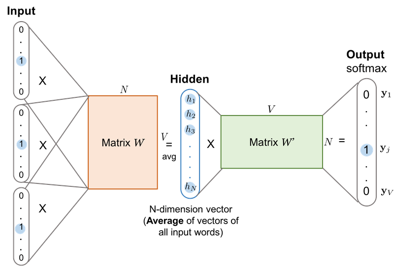 위 그림은 원-핫 벡터로 변환된 다수의 주변 단어를 이용해 원-핫 벡터로 변환된 중심 단어를 예측할 때의 CBoW의 동작 메커니즘을 보여줍니다.