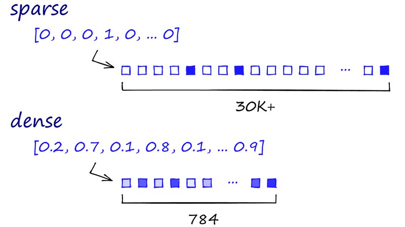 워드 임베딩에서도 단어를 벡터로 바꾸지만 벡터의 길이를 일정하게 정해줍니다. 일반적으로 벡터의 길이를 정해줄 때 단어장 크기보다 매우 작은 길이로 정해주기 때문에 각 벡터 값에 정보가 압축되어야 하고 결국 밀집 벡터(Dense vector)가 됩니다.