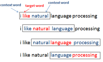 예를 들어 위와 같은 문장이 있다고 가정하겠습니다. CBoW는 중간에 있는 단어를 예측하는 방법이므로 {i, like, language, processing}으로부터 'natural'을 예측하는 것입니다. 이때 예측해야 하는 단어를 중심 단어(center word)라고 하고, 예측에 사용되는 단어들을 주변 단어(context word)라고 합니다.