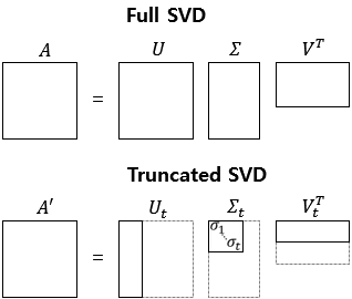- 이후 $U$와 $V$행렬에서 $\Sigma_k$에 대응하는 부분만 남겨 $U_k$, $V_k$를 만들어줍니다.