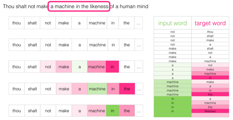 앞서 살펴본 그림입니다. CBoW의 경우 슬라이딩 윈도우 방식으로 얻을 수 있는 데이터는 5개였습니다. 하지만 Skip-gram은 데이터의 구성부터 다릅니다. 중심 단어로 주변 단어 각각을 예측하기 때문인데요. 아래 표와 같이 데이터를 구성하게 됩니다.