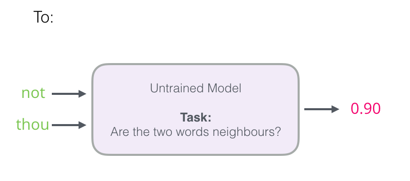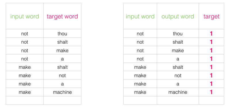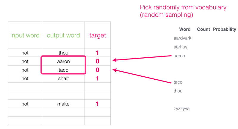 다시 말해 랜덤으로 단어장에 있는 아무 단어나 가져와 target word로 하는 데이터셋을 만들고 0으로 레이블링을 해주는 것입니다. 거짓(negative) 샘플을 만드는 방법이기 때문에 이를 네거티브 샘플링이라 부릅니다.