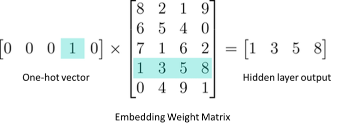 주변 단어로 선택된 각 벡터는 첫 번째 가중치 행렬($W$)과 곱해지게 됩니다. 이때 가중치 행렬의 크기는 $(V \times N)$입니다. 그런데 원-핫 벡터의 특성상 원-핫 벡터와 가중치 행렬과의 곱은 가중치 행렬의 $i$위치에 있는 행을 그대로 가져오는 것과 동일합니다.