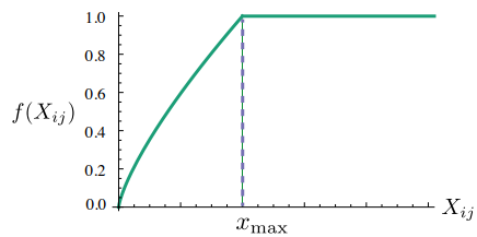 그리고 손실 함수에서 $f(X_{ij})$ 함수는 가중치 함수(weighting function)로 동시 등장 빈도의 값 $X_{ij}$에 따라 가중치를 주기 위해 도입한 함수입니다.