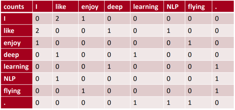 이로부터 만들어진 동시 등장 행렬(Co-occurrence Matrix)은 다음과 같습니다.