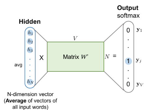 은닉층에서 생성된 $N$차원의 벡터는 두 번째 가중치 행렬($W^\prime$)과 곱해집니다. 이 가중치 행렬($W^\prime$)의 크기는 $N \times V$이므로, 곱셈의 결과로 나오는 벡터의 차원은 $V$입니다. 출력층을 활성화 함수로 소프트맥스 함수를 사용하므로 이 $V$차원의 벡터는 모든 값의 합이 1이 되는 벡터로 변경됩니다.