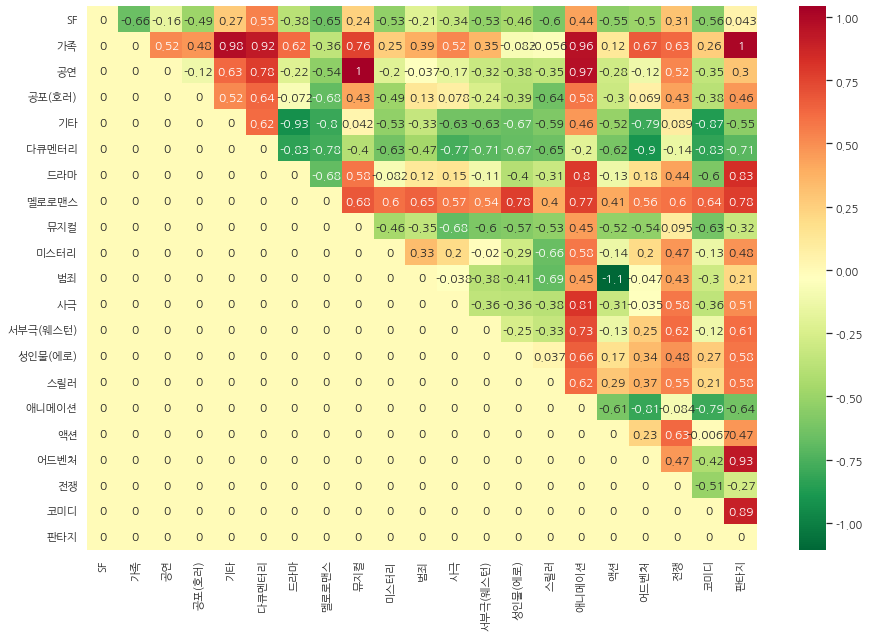 ax = sns.heatmap(matrix, xticklabels=genre_name, yticklabels=genre_name, annot=True, cmap='RdYlGn_r')