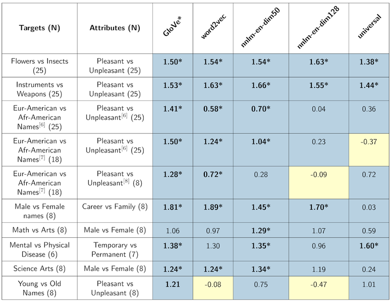 아래 표는 구글의 테크블로그에서 WEAT 개념을 소개하면서 첨부한 실험 결과표입니다.