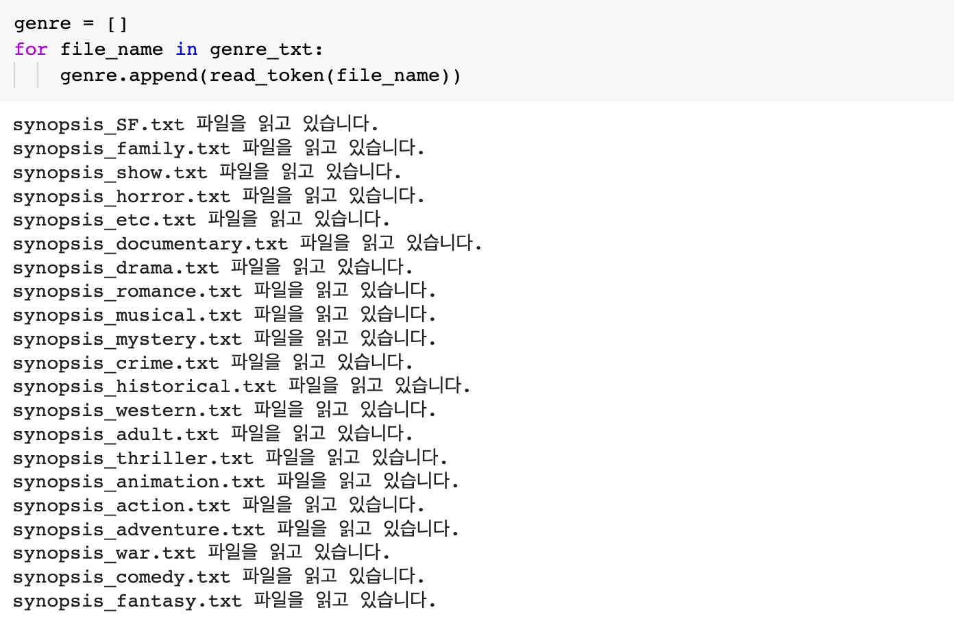 genre_txt = ['synopsis_SF.txt', 'synopsis_family.txt', 'synopsis_show.txt', 'synopsis_horror.txt', 'synopsis_etc.txt',