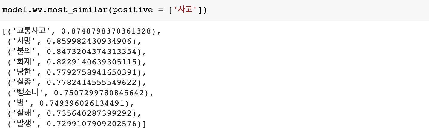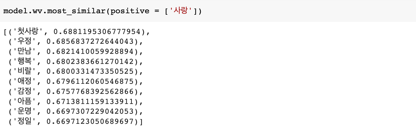 비슷한 단어를 잘 뽑아내는 거 보니 Word2Vec 훈련이 잘 된 것 같습니다.