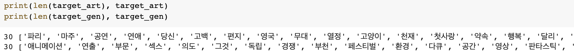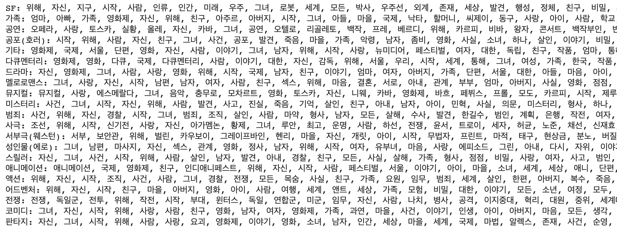 이제는 모든 장르에 대해서도 동일한 방법으로 대표 단어들을 뽑아 보겠습니다.