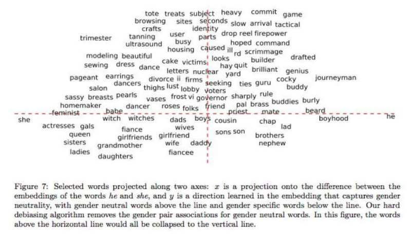 위 그림은 'Man is to Computer Programmer as Woman is to Homemaker? Debiasing Word Embeddings'라는 논문에 포함된 것입니다. 이 논문의 저자는 학습된 Word Embedding을 2차원으로 차원 축소하여 시각화했을 때, 젠더 중립적인 단어임에도 불구하고 Programmer, Doctor, Engineer 등의 단어는 남성 대명사 He에 가깝게, Homemaker, Nurse, Hairdresser 등의 단어는 여성 대명사 She에 가깝게 위치하는 것을 보여줍니다.