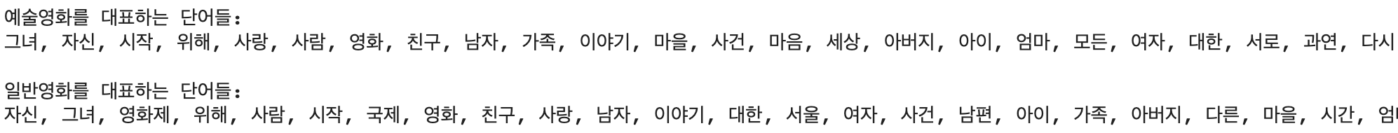 # w1에만 있고 w2에는 없는, 예술영화를 잘 대표하는 단어를 30개 추출한다.