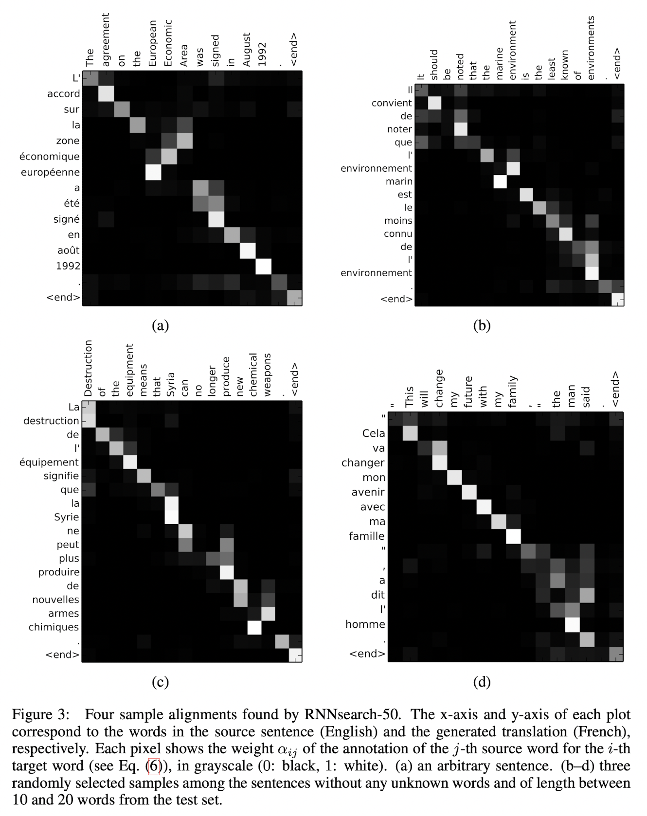Figure 3은 annotation weights $\alpha_{ij}$를 시각화한 것입니다. 이를 통해 우리는 target word를 만들어낼 때 source sentence의 어느 부분을 중요하게 여겼는지 알 수 있습니다. 색이 어두울수록 가중치가 작은 것입니다.