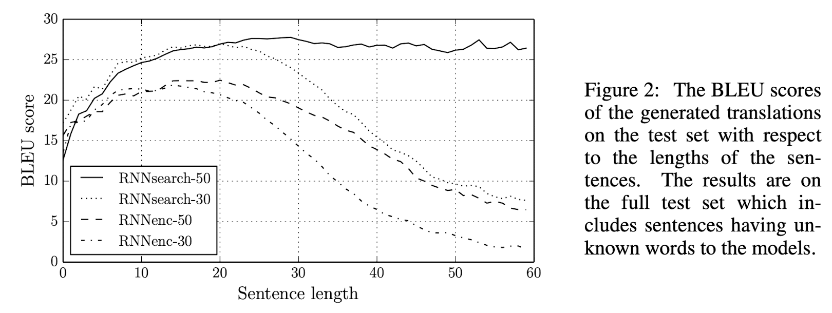 위 그래프는 처음에 논문에서 고정된 길이의 벡터로 바꾸는 방법은 문장이 길어질수록 성능이 낮아질 것이라는 주장을 뒷받침하는 결과입니다.