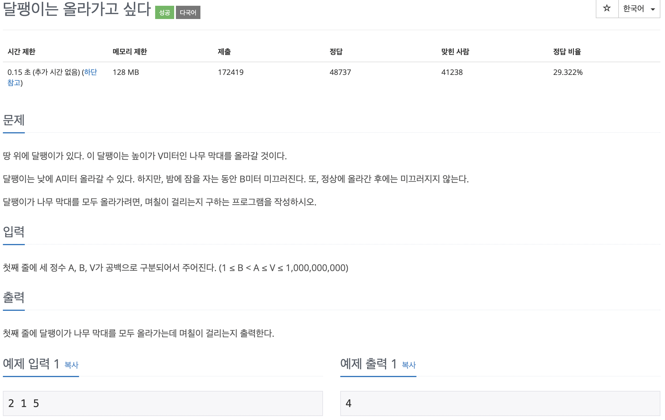 문제를 풀 때 정상에 도착하면 내려오지 않으니까 전체 길이 v에서 하루에 올라갈 수 있는 거리 a를 빼고 그 길이를 올라가는 날짜만 계산하면 될 거라생각했지만 틀렸습니다.