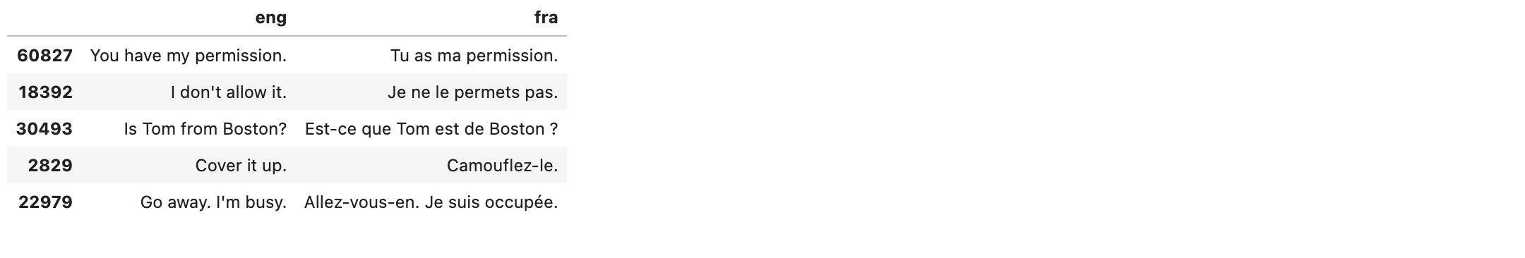 for eng, fra in zip(lines.eng, lines.fra):