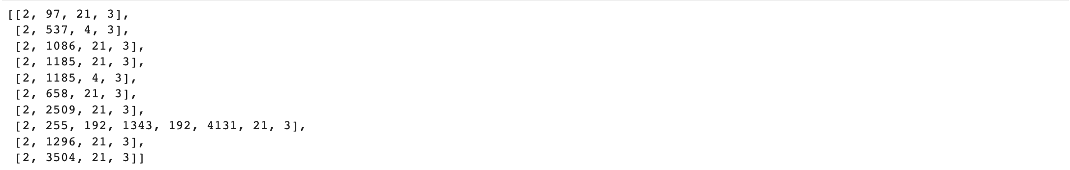 위의 텐서를 보면 길이가 다른 것을 볼 수 있습니다. 이렇게 길이가 다른 상태로 모델에 입력으로 들어가면 문제가 생기기 때문에 길이를 맞춰주기 위해 나중에 패딩을 추가해주겠습니다.