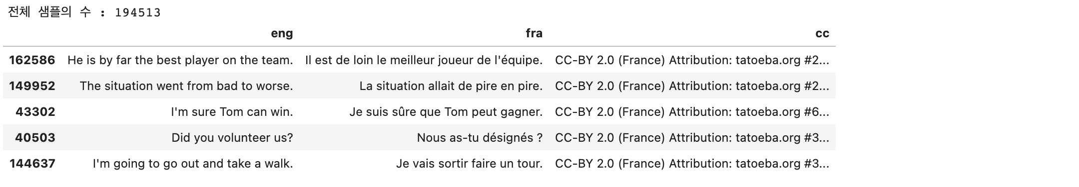 cc컬럼의 데이터는 번역에 딱히 영향이 없어 보입니다. cc컬럼을 제외한 나머지만 사용하겠습니다.
